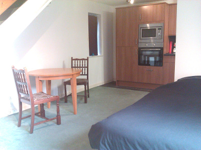 There is a kitchen partitioned off at the end of the lounge.  It is modern and has all facilities one would expect in a kitchen. Also comprising an extra freezer and washing machine.